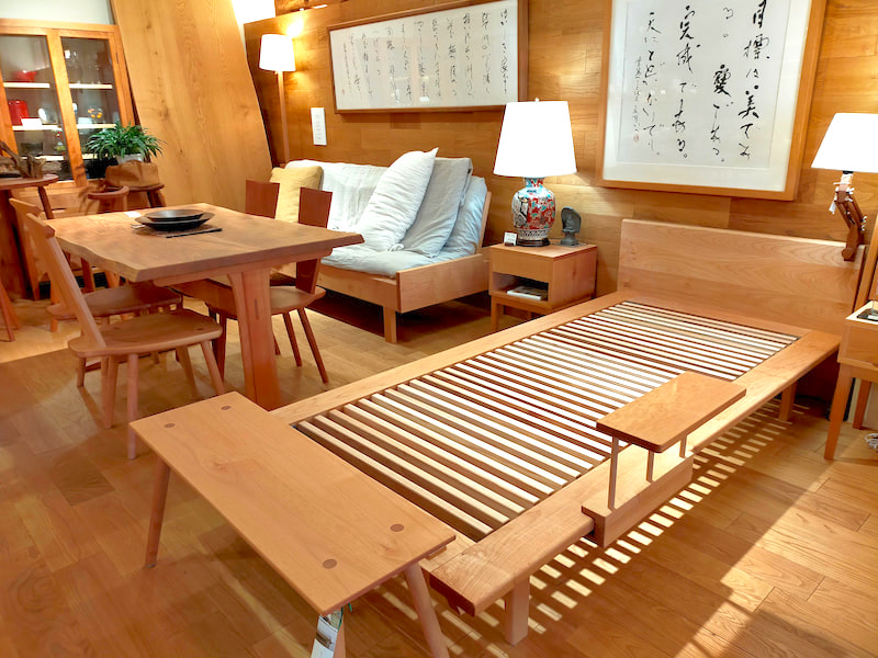 当店ではお客様に、伐採・製材・乾燥の工程を経て家具になるまでの流れをなるべくお伝えしています。歴史の重みや自然環境のサステナビリティを知ることで、古来より自然と共生してきた日本人の感覚と、現代の暮らしを重ね合わせることができます。