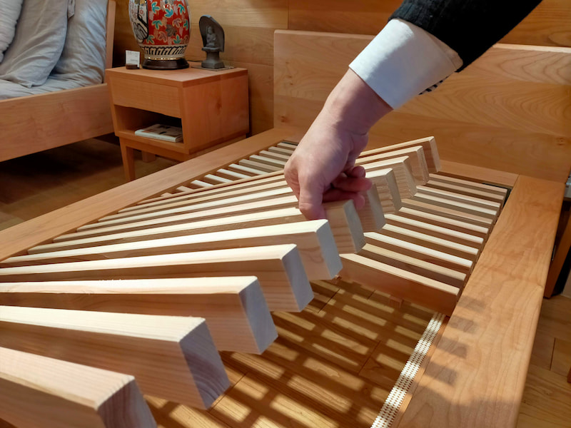 当店のベストセラーは、布団を敷いて使うスリットベッドです。マットレスの性能次第で腰を痛めるようなベッドをつくりたくなくて、きしみやゆがみを抑制し長く性能を保つよう試作を重ねました。