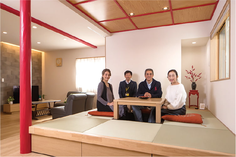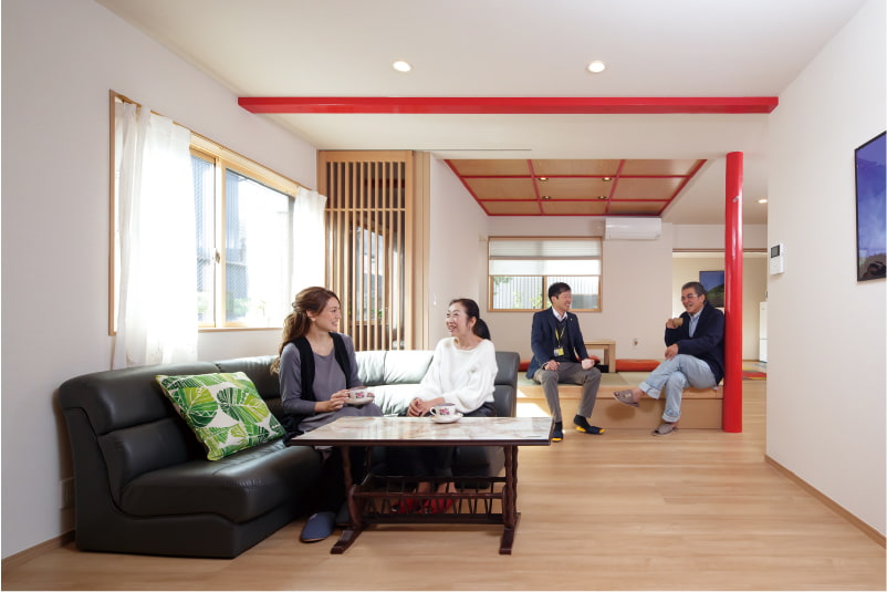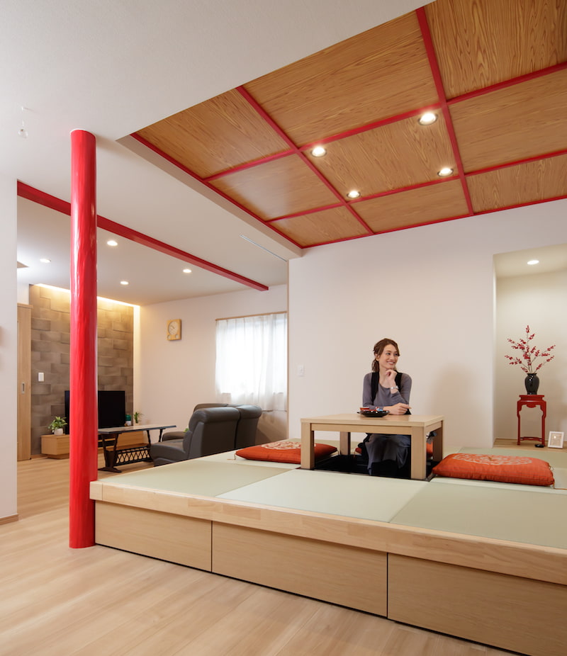 リフォーム前は和室と玄関ホールがあった空間。柱と壁を撤去して、小上がりのあるLDKに。丸い柱は補強のために新たに設けたもので、施主様のリクエストで朱色に塗装しました