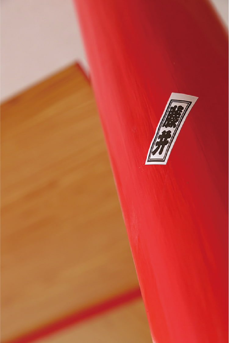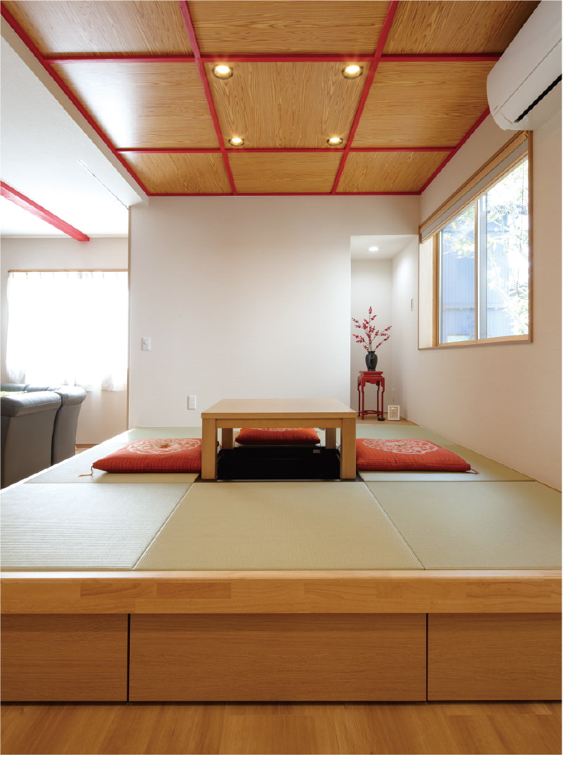 室内でまず目を奪われる柱の朱色は、格天井の格子と共に空間の美しいシンボルになっています。格天井は、金沢・成巽閣の「群青の間」に感銘を受けたご主人のリクエスト。群青ではなく朱色を選ばれたのは、輪島塗をイメージされてのことです。格天井と小上がり、格子戸のある家は、マンション住まいのご主人の憧れでした。