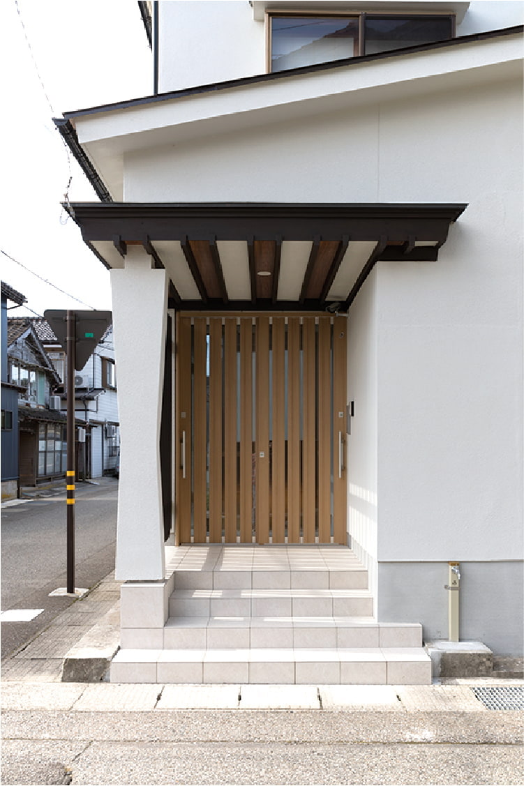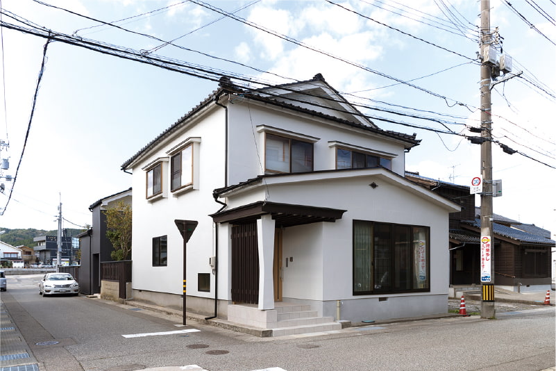 朝市とキリコ祭りで有名な能登・輪島の市街地に佇むF様邸。昔ながらの長屋が軒を連ねる街並みに、モノトーンのシックな外観が引き立ちます。こちらは野々市市にお住まいのF様の別邸で、地元で休暇を過ごすためご実家をリフォームされました。