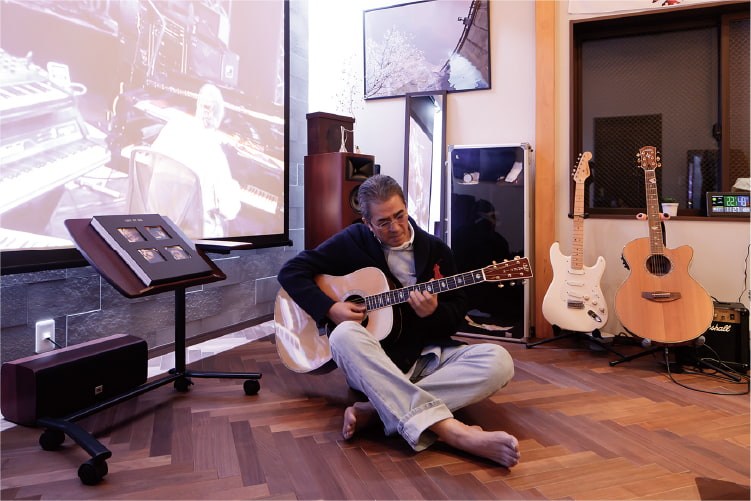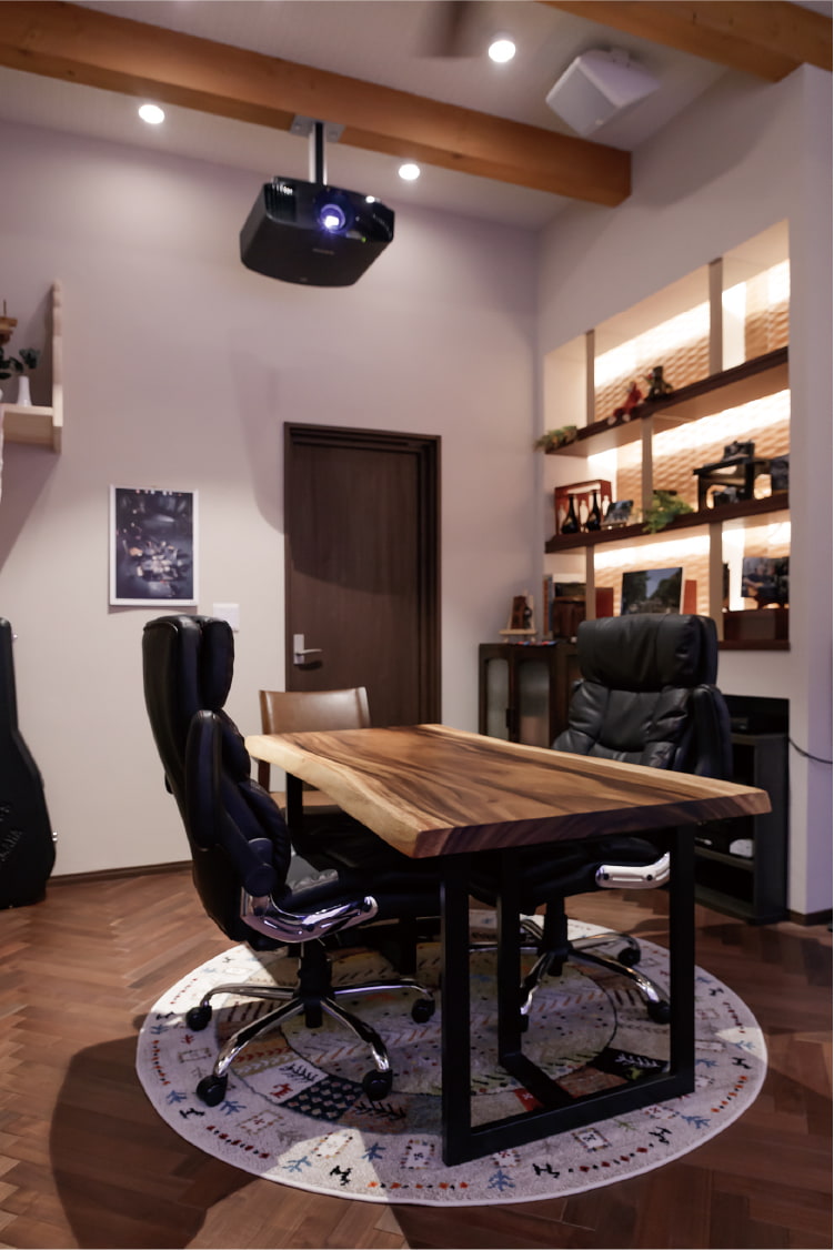 間接照明に照らされるワイドスクリーンは迫力満点。色を自在に変えられるライトを採用し、音楽に合わせた多彩な光の表情と、壁に用いた石模様のエコカラットの重厚な陰影も楽しめます。また、美しい木目が特徴のモンキーポッドの一枚板を使用したテーブル、ブラックウォールナットを使ったヘリンボーンフローリングが、空間に異国情緒を添えています。床暖房対応の無垢フローリングは保温性が高く、床暖房を1〜2時間稼働させるだけで一晩温かさを保つそうです。