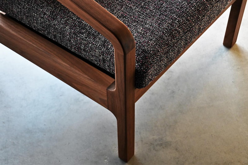 北欧産の家具は、芯材の上に薄くスライスした突き板を貼った仕様が一般的ですが、当店では突き板を使わず無垢材を使います。無垢材イコール一枚板というイメージもありますが、一枚板は高価になりすぎるためテーブルなどにはあえて使用せずに、幅方向に何枚かの無垢材を接着した幅はぎ材を使っています。木目もデザインのひとつと考え、専任の職人が繋ぎ目の美しさまでこだわっていますので、一枚板と遜色のない木目の美しさを実感いただけると思います。