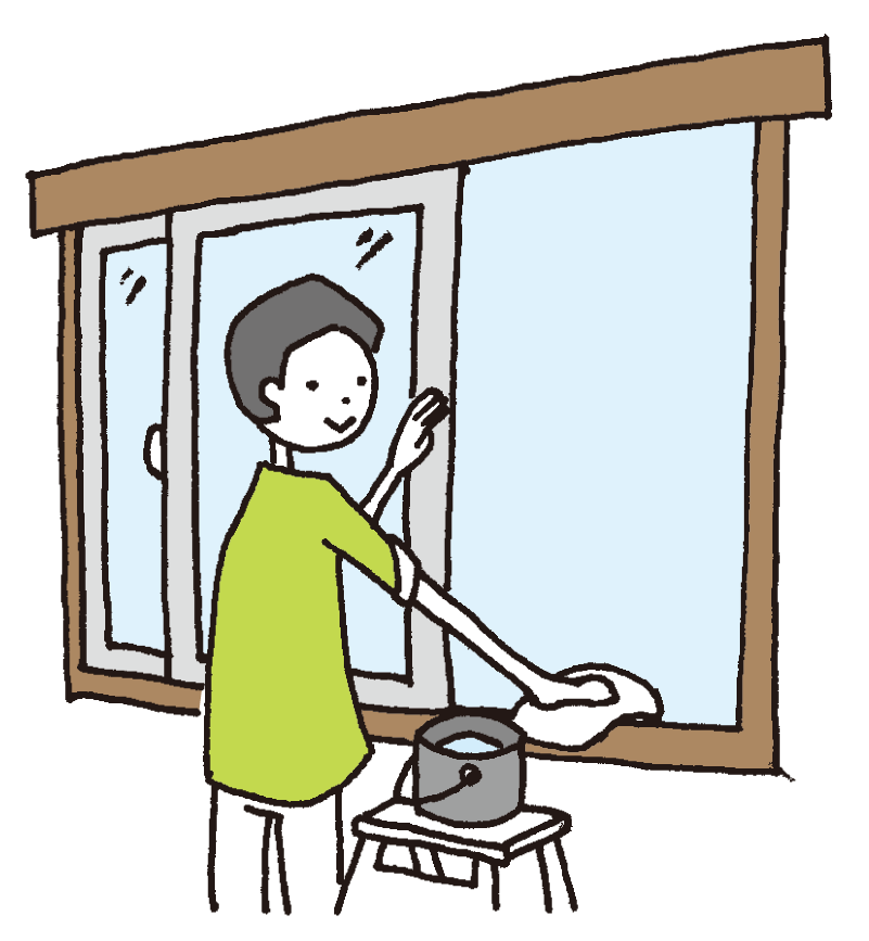 | 普段から、ハタキかけや拭きそうじを。 窓の下枠はガラス拭きの際に汚れが落ちることがあるので、最後にきれいにしよう。 | |