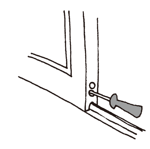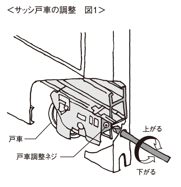 ドライバーで戸車の高さを調整。サッシ戸の側面下にあるプッシュボタンを外し、調整ネジを目して調整。サッシを上げたいときは時計回り、下げたいときは反時計回りに回す。(図1参照)