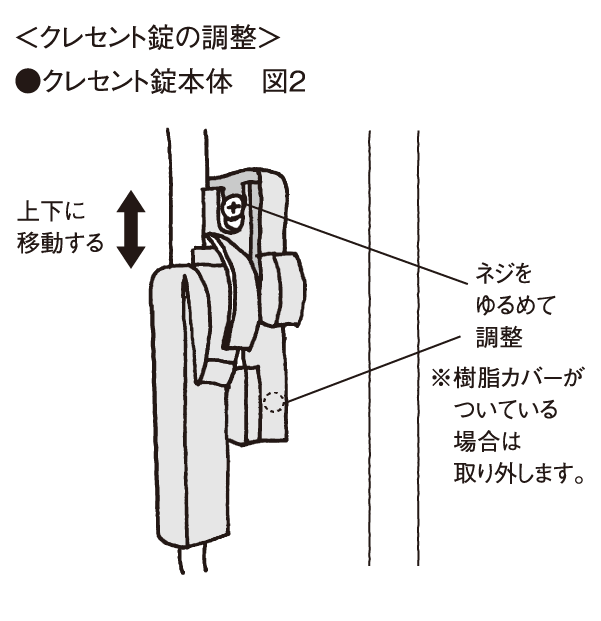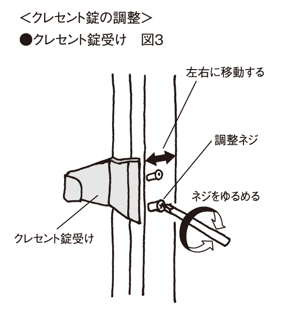 クレセント錠本体は上下に、受けの部分は左右に可動させる。かかりやすい位置に合わせて、ネジをしっかりと締める。(図2・3参照)