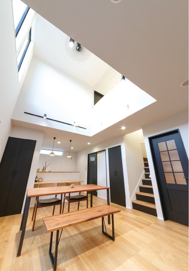 家の中心には吹き抜けがあり、LDKから2階まで、自然光がたっぷりと入ります。隣家との距離が近いのでカーテンを閉めることが多いと想定し、採光のための窓を吹き抜け部分に大きくとりました。2階の天井部分が階段の吹き抜けまで繋がっているので、開放感があり実際よりも広く感じられます。