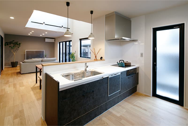 スタイリッシュなキッチン。建具と合わせてモノトーンで統一。キッチン左手に勝手口、右手にはパントリー兼家事室があり、機能性も抜群です