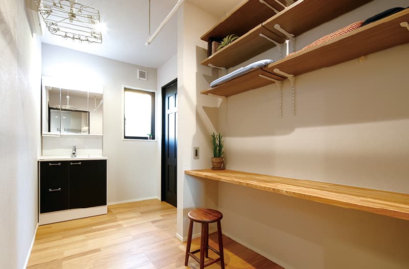 広さを活かし、間取りには要望の高いものをふんだんに取り入れました。キッチン横の広い家事室兼洗面室には、カウンターデスクやシェルフを造作し、自由度の高い使い方ができます。また、洗面室と脱衣室が分かれ、お風呂の時間に関わらず、洗濯や身支度ができます。