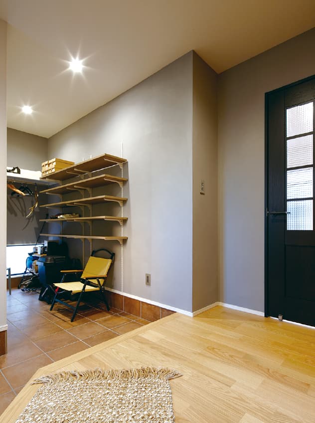 エイジング加工のタイルが施された玄関は、優しげな雰囲気で家族や来客を迎えてくれます。動線にこだわったこの家は、玄関ホールから2方向に通路がレイアウトされ、リビングを通らずに浴室やキッチンに行くことができます。