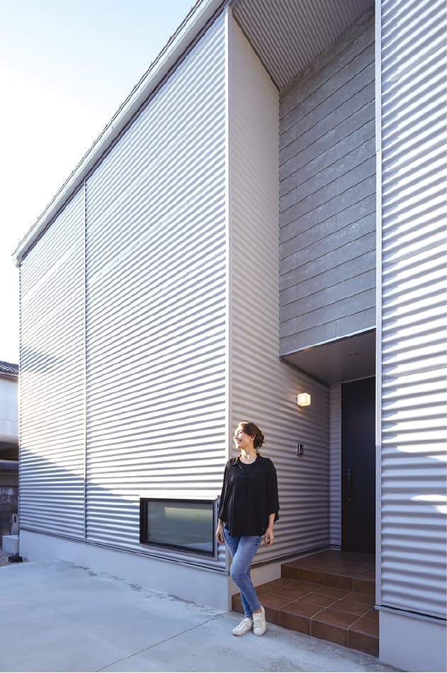 倉庫などに使用される大波ストライプのガルバリウム鋼板でインダストリアルを強調した外観デザイン。凹みラインには、一枚一枚表情の違う、無垢セメントの「SOLID」というバネルを施工