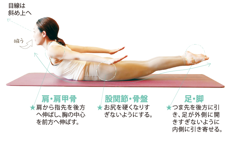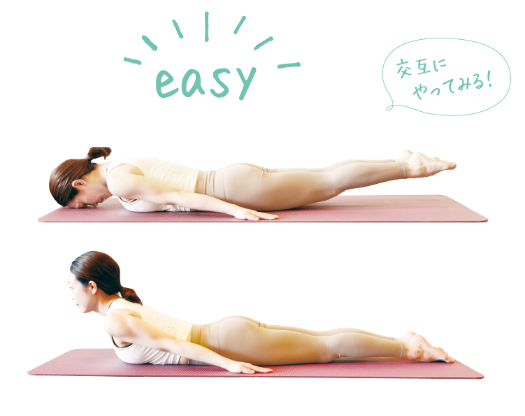 手だけを上げたり、手を床につけたまま頭と胸、両足を上げたりと、別々に練習しても良い。