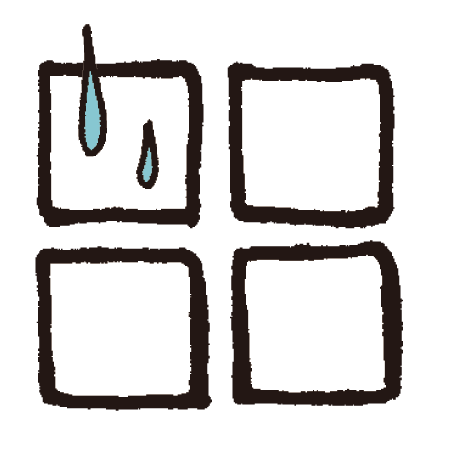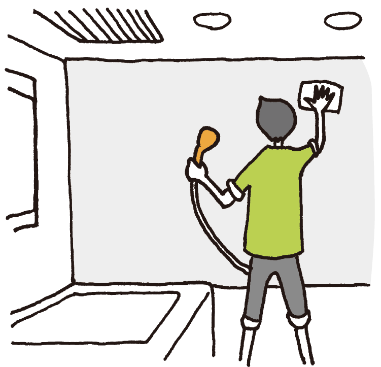 | 水を入れたバケツを用意し、古タオルなどをしっかり浸してよく絞る。拭くときは、居室側から排水用の溝にかけて水拭きを。最初に多めの使い捨て布を用意しておくとおそうじがスムーズ。 | |