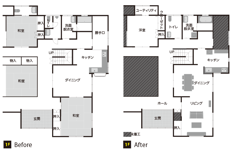 築25年の祖母様のご実家にお住まいのH様ご夫妻。1年ほど暮らしてみたところ、寒くて使いにくい水廻りに悩まれ、リフォームを決められました。「せっかくリフォームするのなら、家の中のイメージをがらりと変え、キッチンは〝カフェ風〟にしたい」とのご希望に応じ、カフェ風キッチンが似合うおしゃれな空間にプランニング。