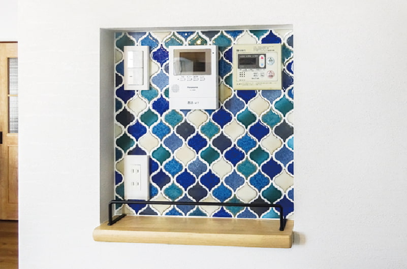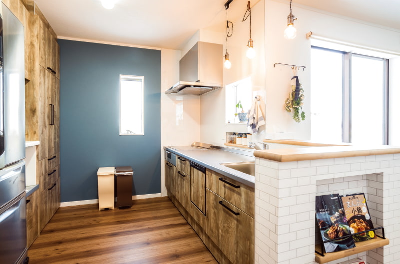 キッチン廻りには、奥様こだわりのアイデアが盛り込まれています。シャビーシックな木目調のキッチンキャビネット、ネイビーのアクセントクロス、裸電球のペンダントライトがカフェっぽさを演出。スパイスニッチ、マガジンニッチ、リモコンニッチを適所につくり、片付けの悩みを解消。ニッチの背面には、美しくコーディネートされたデザインタイルが彩られています。これは奥様が悩みに悩まれた末カスタムメイドされたもので「見る度に嬉しい気持ちになります」とご満悦いただいています。
