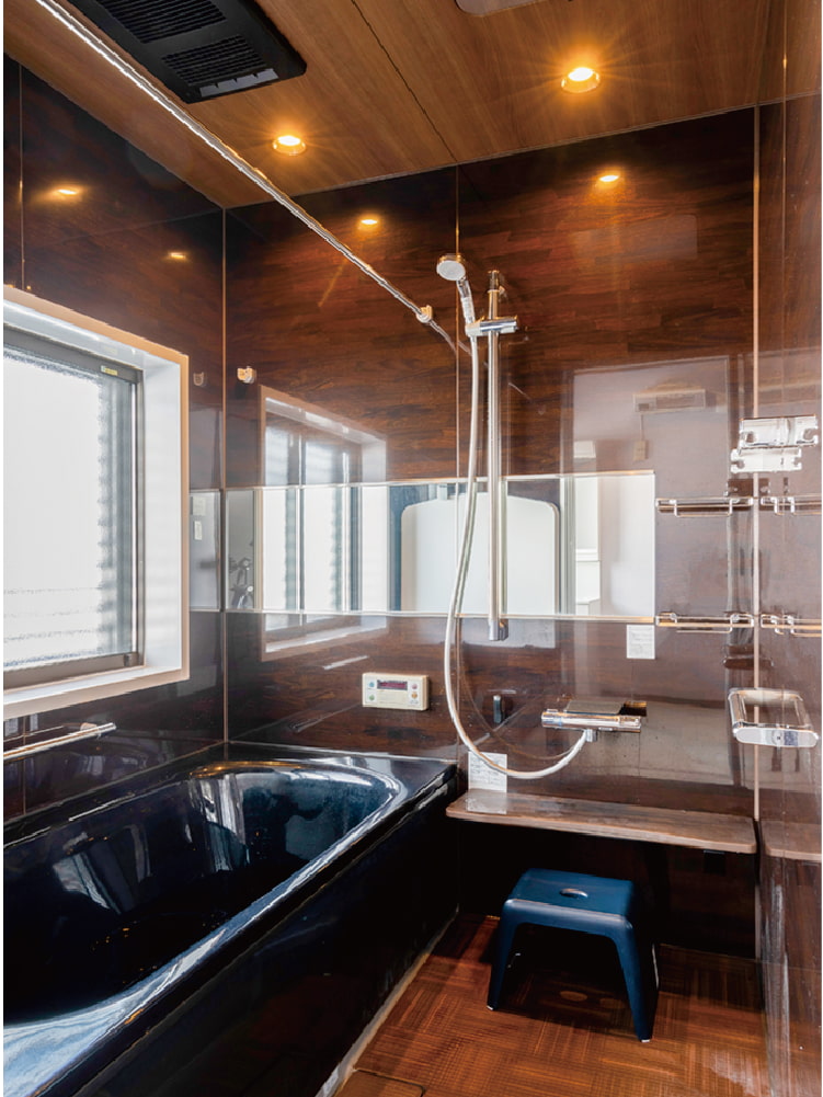 黒が基調の重厚感のあるお風呂。日々の疲れを癒す安らぎの空間に