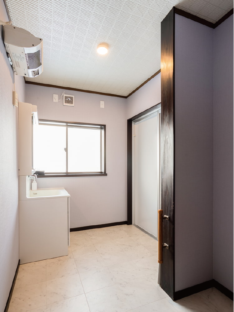 洗面脱衣室。床にはお掃除しやすい大理石調デザインのクッションフロアを