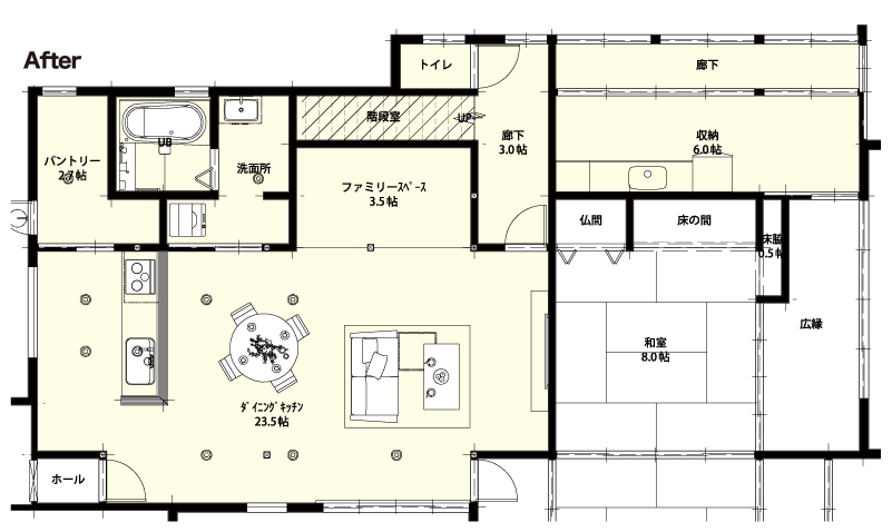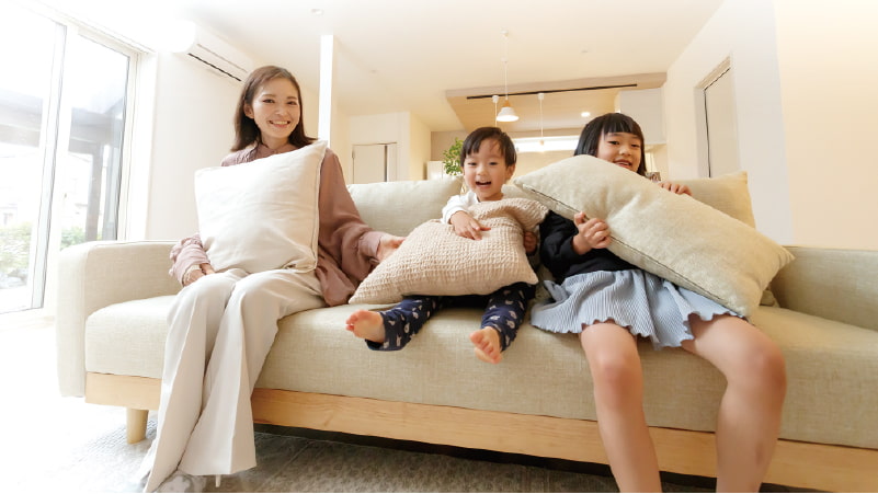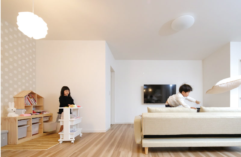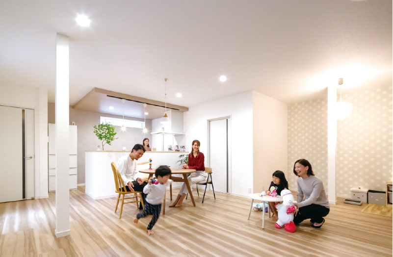 間取りは広々LDKに洗面室、浴室を新設。リビングの一角にはお子さまたちが遊べるファミリースペースを設けました。