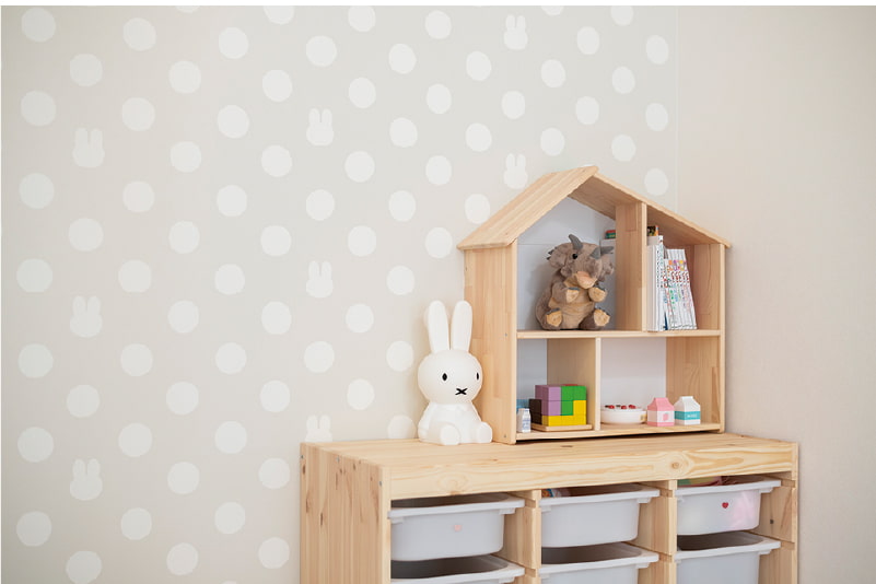 築80年の店舗兼住居で、ご両親と同居されているS様ご夫妻。本格的に二世帯住宅へ改修するにあたり、新しくつくられた若世帯のためのLDKは、小さなお子様達と過ごすのにもぴったりの優しく明るい空間です。リビングの一角は、お子様が遊べるファミリースペースとし、アクセントウォールに淡いグレージュのミッフィー柄のクロスを貼りました。遠目にはドットに見えるさりげない柄は奥様の一番のお気に入りです。