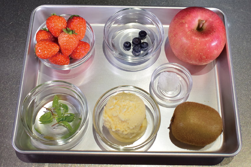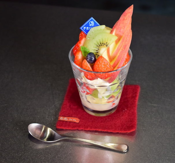 (3)で作った飾りりんご、1/2のいちごとキウイ、ミントを飾り、完成。