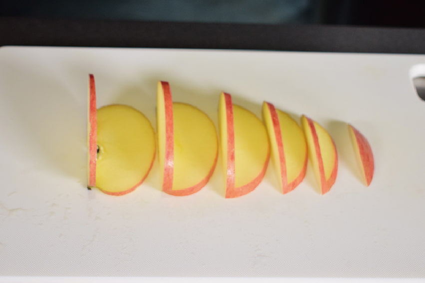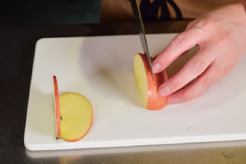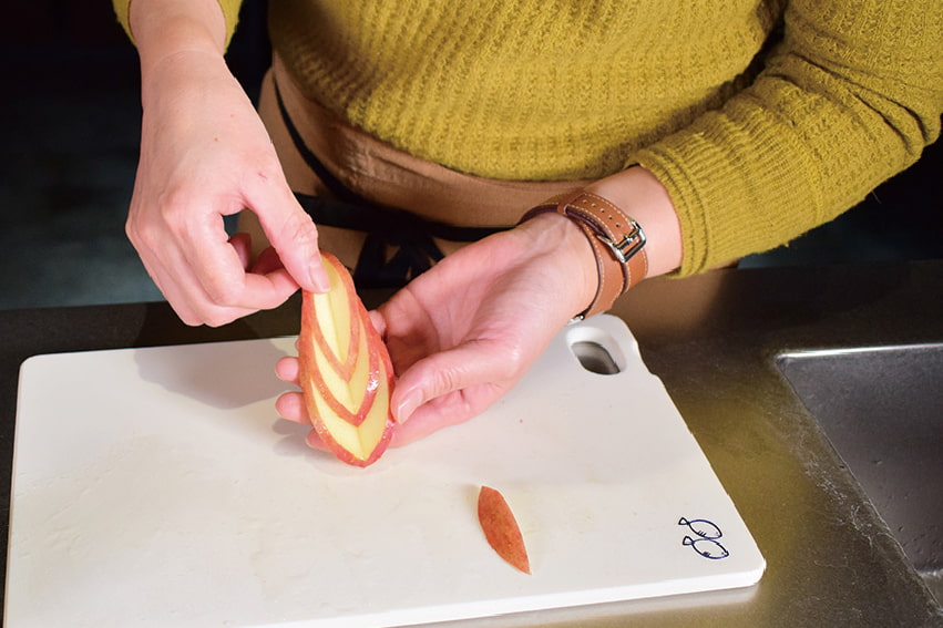 りんごを1/4に切り、5mmほど間隔を空け、直角にカットする。
