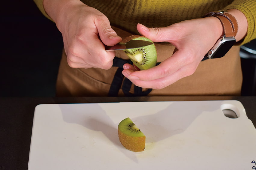 キウイはへたの周りに切り込みを入れて、手でへたをまわし、へたと芯を取り除きます。反対側は薄く切り落とします。