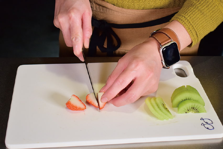 キウイのヘタをとり皮をむき、5mmにスライスし、1/2と1/4にカット。