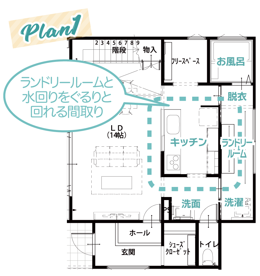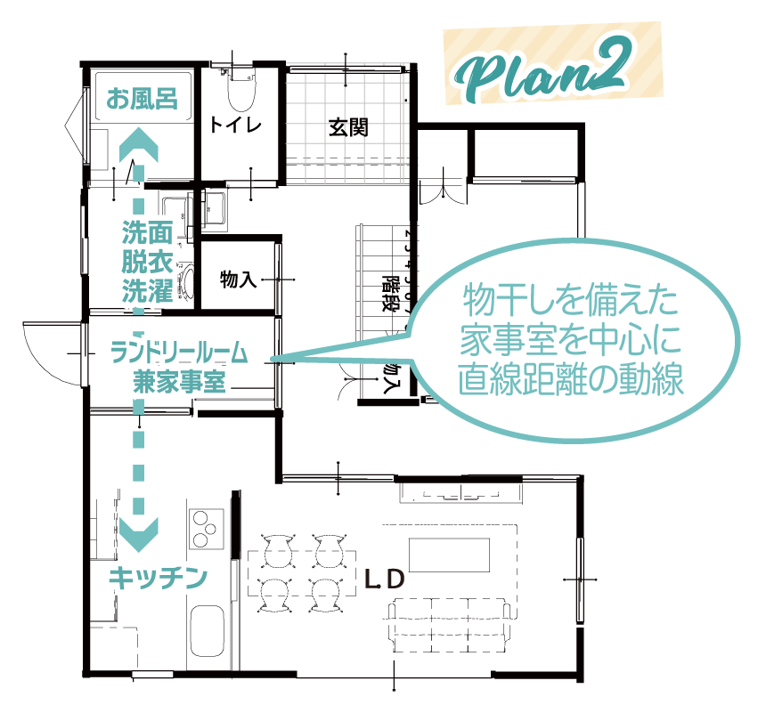 洗う→干す→取り込む→アイロンがけ→たたむ→しまう、といった洗濯に関わる多くの工程が、1つの部屋で完結できれば、家事効率が上がり時間短縮になります。