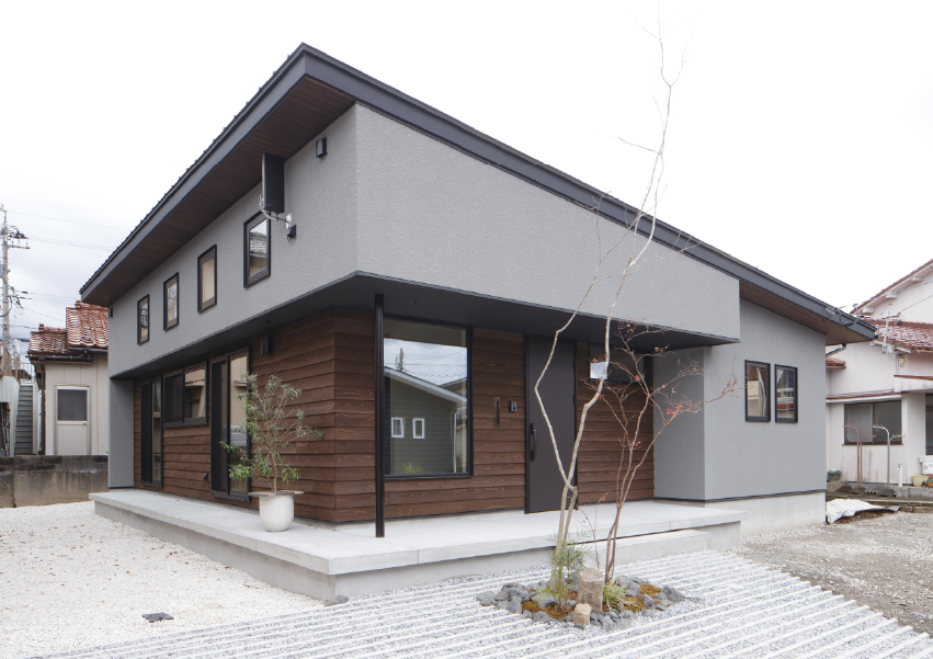 石庭を思わせるアプローチ、片流れの屋根、グレーの漆喰風の外壁と杉板の組合せでネオジャパネスクな雰囲気を纏う、Freedomのモデルハウス。家というよりギャラリーのような存在感の外観は、平屋暮らしの新しいスタイルを予感させます。
