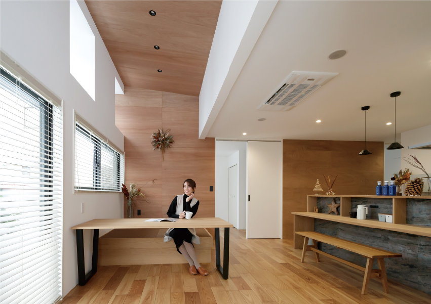 室内に上品な質感を添えているのが、屋根の傾斜を利用した吹抜けと、天井まで続くダイナミックな板目のアクセントウォール、石張りシートを施したカウンターの壁。高窓からは光が注がれ、居心地のよいカフェにいるよう。リビングの一角につくった小上がりの畳空間は、お昼寝したりお子様の遊び場にも最適。下部に引き出し収納を備えていますので、ものが散乱しがちなリビングもきれいに保てます。