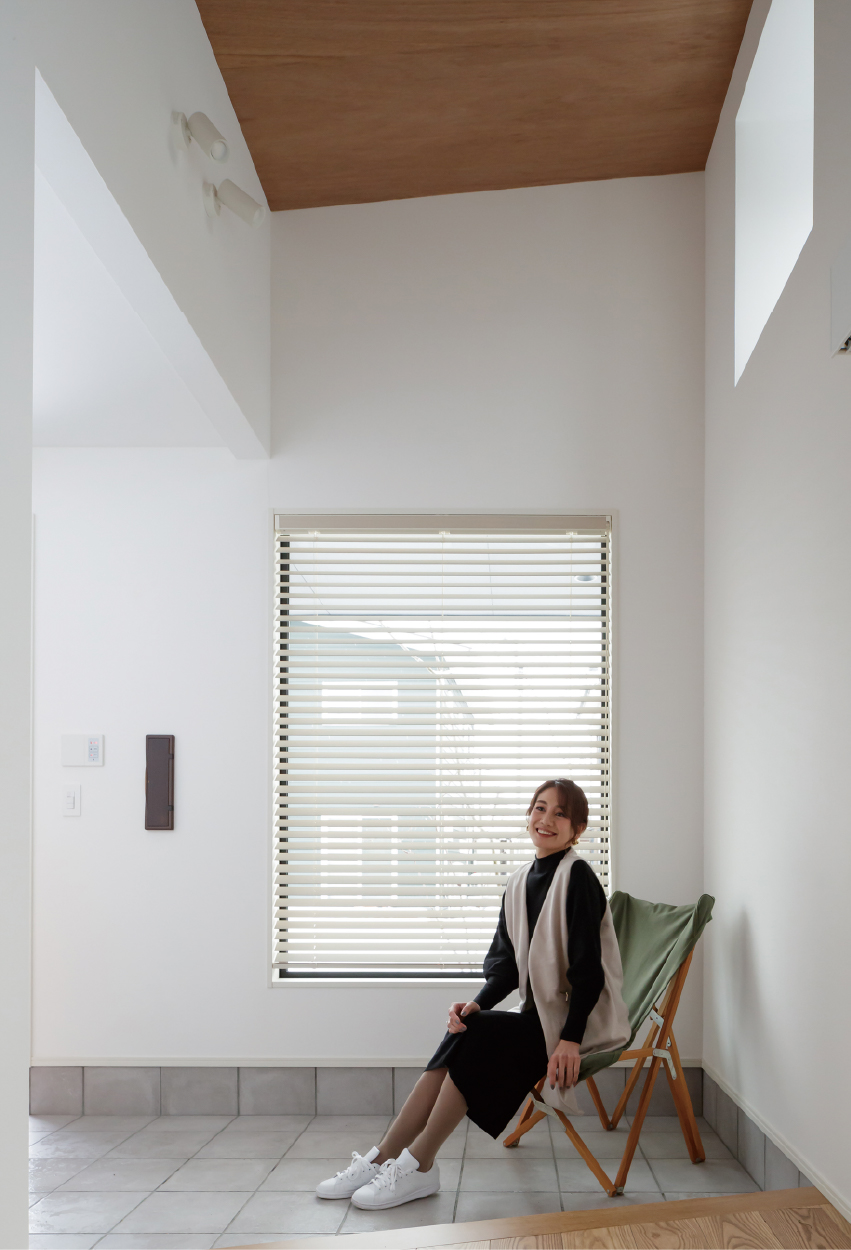 この住まいを最も特徴付けているのが、玄関の大きな土間。玄関ホールを持たずに直接リビングに接している土間スペースは、リビングに居ながら屋外で過ごすような特別感をもたらしてくれます。天井の高さや床の汚れを気にする必要がないので、バイクやアウトドア用品のメンテナンスや、アトリエ、DIYやガーデニングなど趣味に没頭できる場として使い方の幅が広がります。また、広い玄関収納とファミリー玄関を備えているため、リビングから散らかった靴が目に入ることもありません。