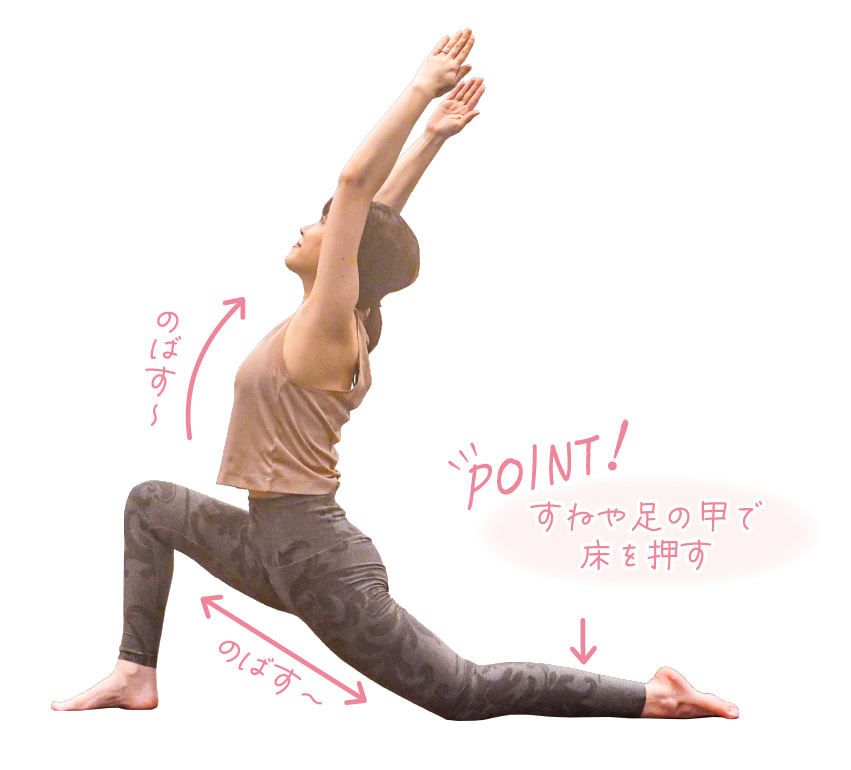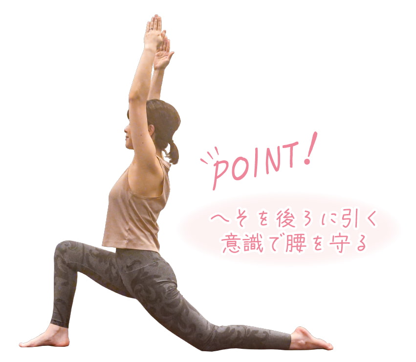 上へと伸ばした腕から後ろ足にかけてのラインが三日月のような弧を描くことから名付けられたポーズ。リンパが多く集まる鼠径部を刺激します。むくみや疲労回復にも効果があります。