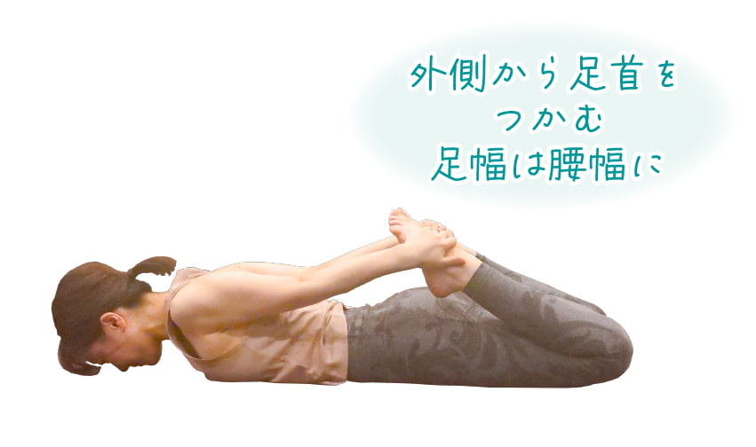 うつ伏せになり、額を床につける。 両ひざを曲げ、両手で両足首をつかむ。
