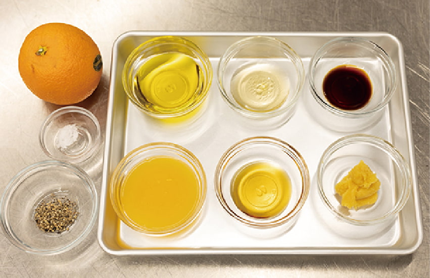 オレンジ、オリーブオイル、白味噌、酢、ごま油、醤油をボウルに入れる。