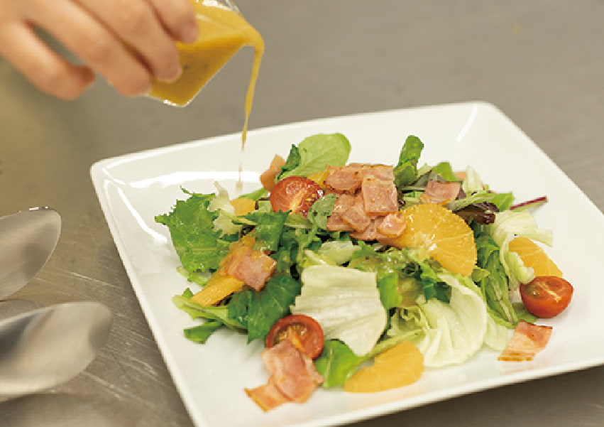 盛り付けた野菜にオレンジドレッシングをかけて完成。
