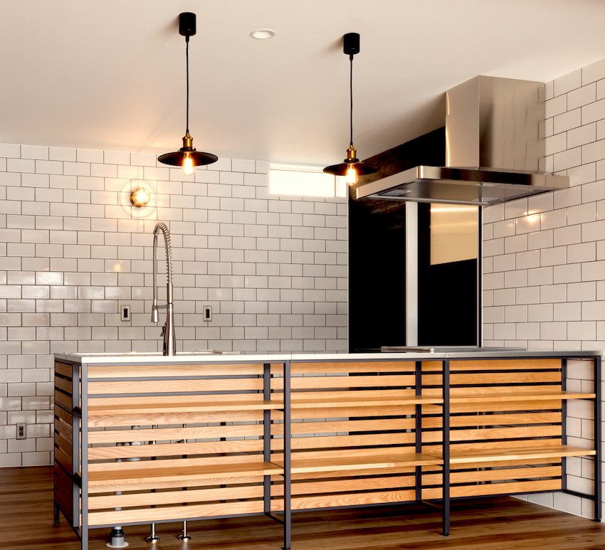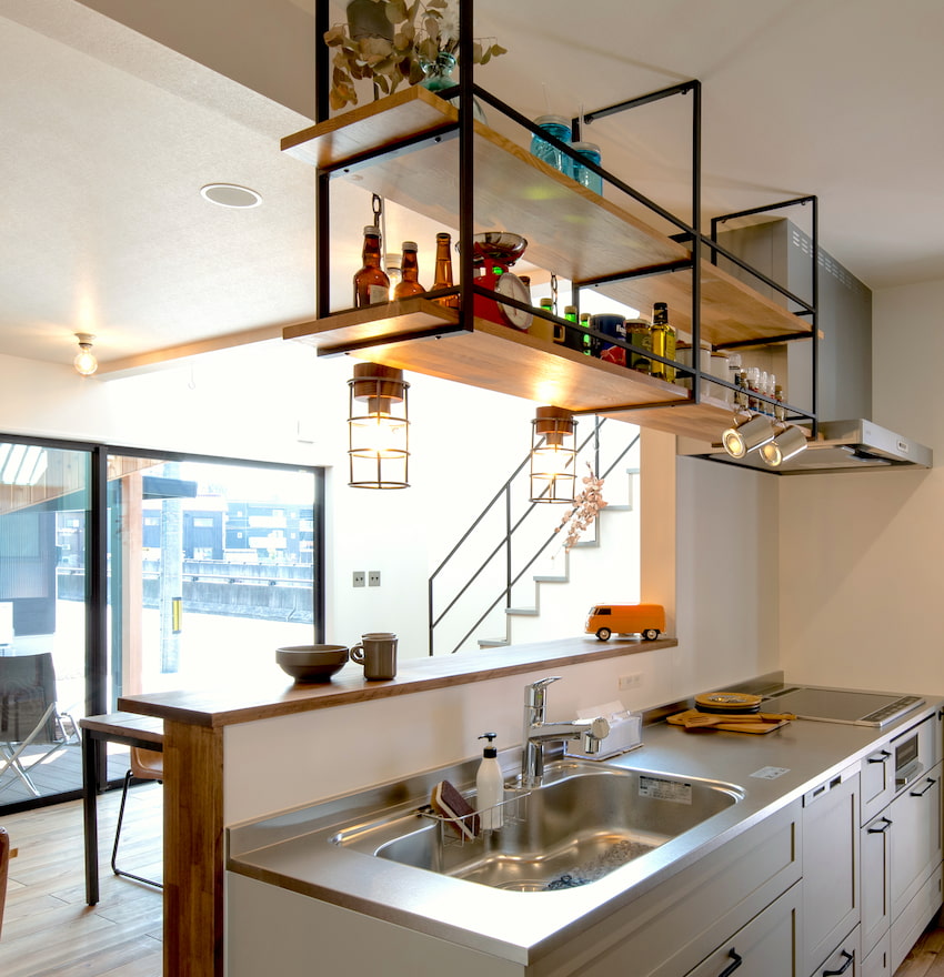対面キッチンとカウンターの組み合わせは定番のカフェスタイル。吊り戸棚はつけずに開放感をもたせましょう。可能であれば、コンロの前の壁もなくせばより開放的。油はねが気になるなら、壁の代わりにガラスのパネルをつけることもできます。