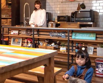 天板やコンロが全て平らなフルフラットキッチンは、オープンキッチンの飲食店の雰囲気もあり、カフェ風インテリアにびったりです。