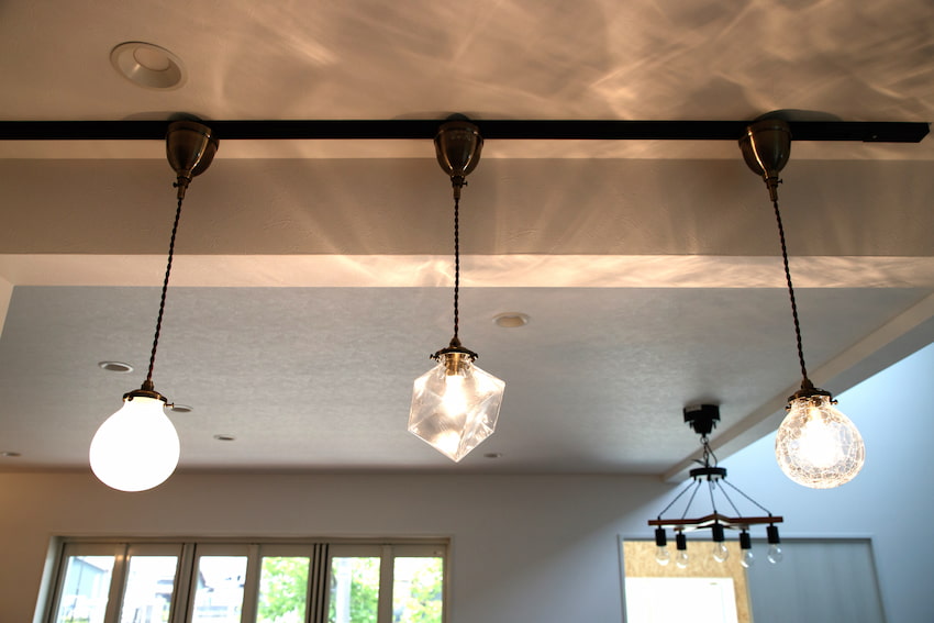 カフェっぽさを演出するカウンターに欠かせないのがペンダントライトです。デザインはインダストリアル風、アンティーク風、またはシェードがシンプルな北欧風がおすすめ。テイストは揃えつつデザインをちょっと変えたものを並べても素敵です。
