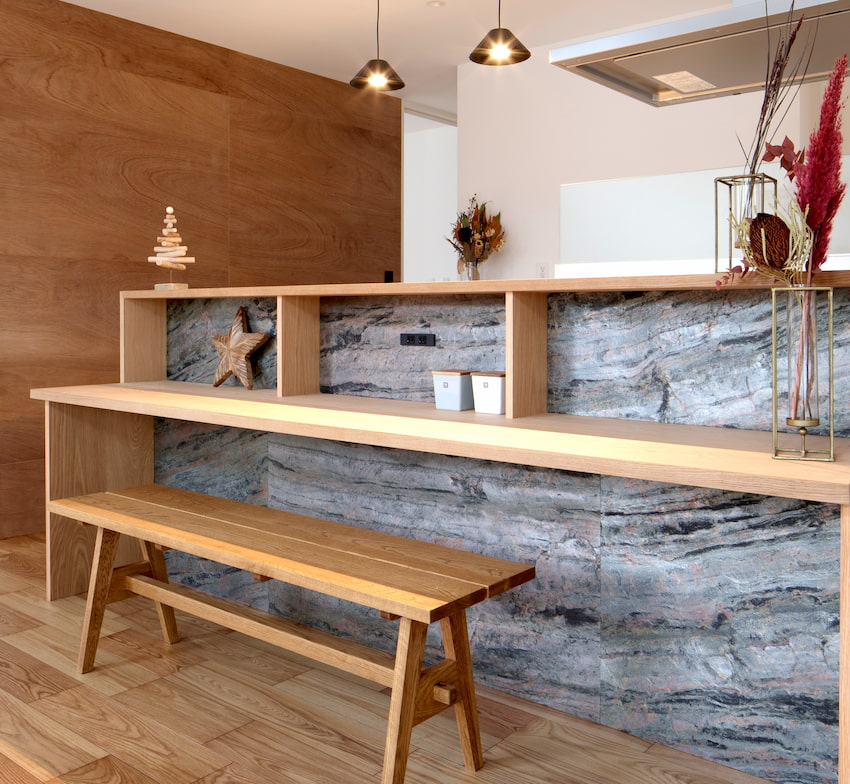 カウンターの壁面の内装の素材を変えると雰囲気がガラリと変わります。おすすめはウッドやタイル。ウッドパネルやデザインパネルには様々な意匠のものがあります。レンガ調もいいですね。