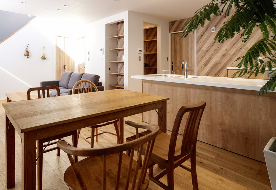 フルフラットキッチンのカウンター下にウッドパネルを施工。デザインが全て異なる椅子は素材感を統一して