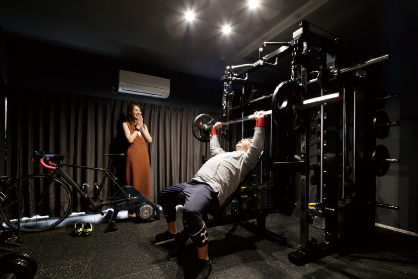 スポーツジムと変わらないトレーニングをこなせるオールインワンジムラックを中心に据え、内装をブラックで統一した部屋は、ここだけ別世界のように目に映ります。「自分だけのジムを作りたい」というのが、中古物件購入とリフォームの一番の目的だったM様。置きたいマシンも既に決まっており、メインマシンの重量は約800kg でしたので、最優先は床の補強でした。その他のマシンと合わせても1トンの重量に耐えられるよう、既存の床束を丈夫な鋼製束に替えて20本設置。床垂木も通常の倍の数を入れ、床はフロアタイルで仕上げました。ダンベルなどを落とした時の傷や衝撃吸収のため、床の上にはジムマットを敷いてあります。ジムマットはM様が購入、ご自身で全て敷き、敷き終えたその日にジムを解約されたそうです。「5年ほど前からジムに通っていたのですが、体を鍛えるのが楽しくなり、マシンの順番待ちや時間制限がありましたし、コロナ禍ではマスクをつけなくてはならず、とてもストレスを感じていました。今は、好きな時間に好きなだけトレーニングできて嬉しいです!」