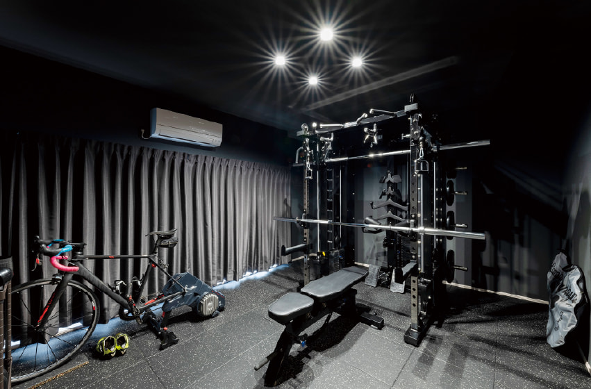 トレーニングルームには様々なトレーニングか可能なオールインワンラック、エアロバイク、大型ミラーを完備。黒を基調にした内装は、スイッチプレートやコンセント、ダウンライトも黒でコーディネート