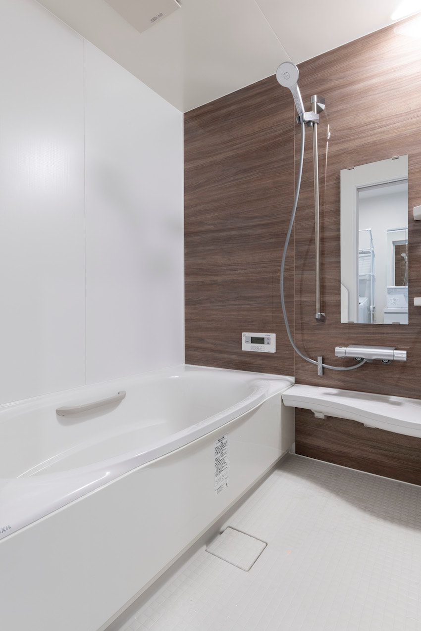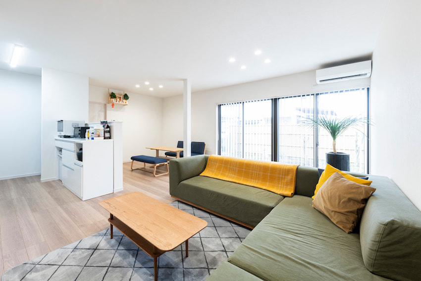 築年数が経っていたこともあり、ところどころ老朽化が激しく、断熱性能も低い家だったため、暮らしやすさのためのリフォームもばっちりです。水回りは全て一新。昔ながらのタイルのお風呂も最新式のシステムバスに。縁側のある二間続きの和室は、大きな窓から入る光が白い壁を照らす明るいLDKに生まれ変わりました。抜けない柱はダイニングとリビングの空間をわけるアクセントに、床にはあたたかみがあり耐久性に優れている和栗のフローリングを施工しました。