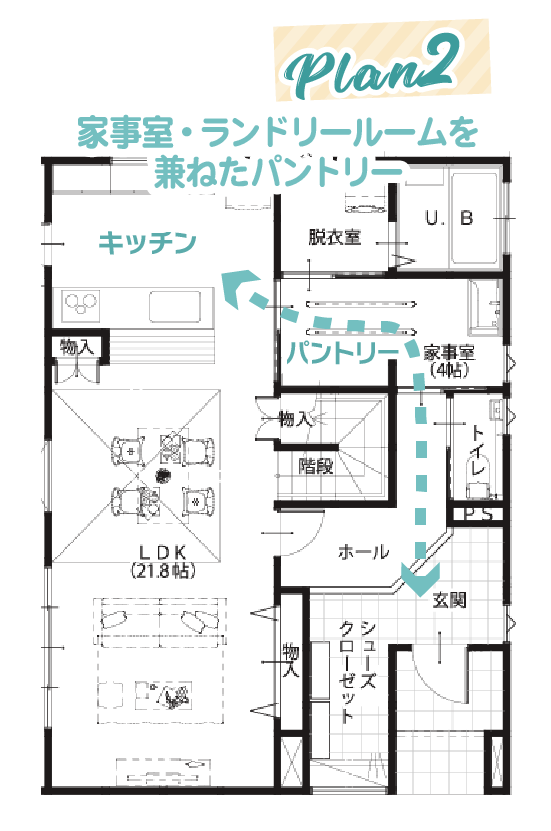 また、洗濯室とパントリーを兼ねれば、隙間時間の家事の効率もアップ。洗濯室と兼ねる場合は、換気扇をつけるなど湿気対策も必要です。