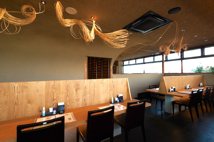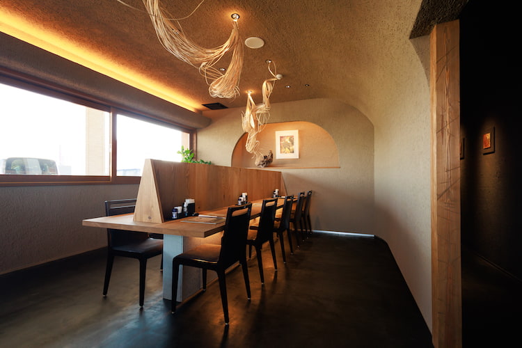 大樋窯の巨匠・11代大樋長左衛門先生が監修したインテリアにも注目。大樋窯の器と空間美が料理を引き立てます