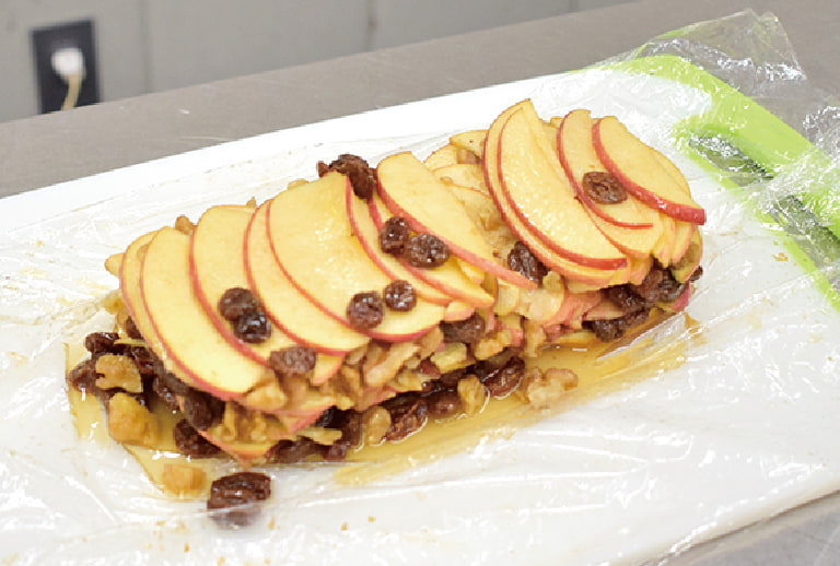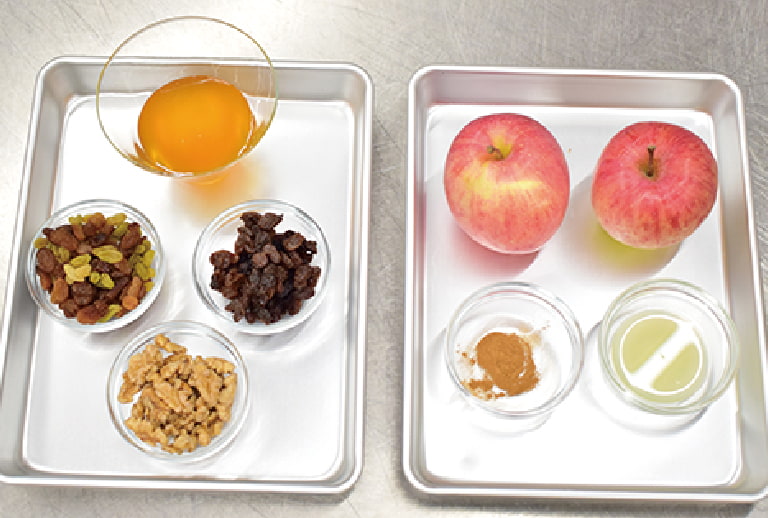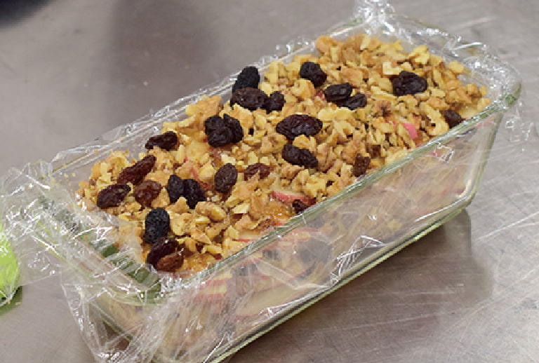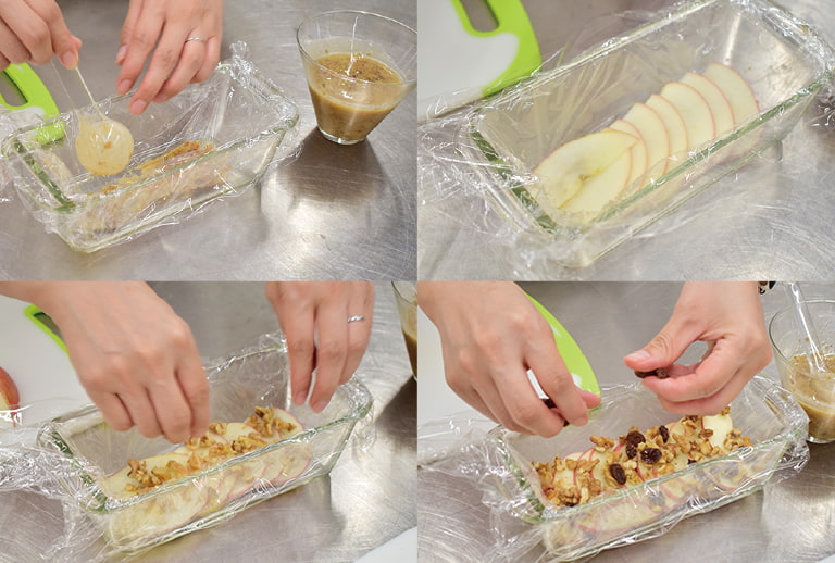 パウンド型にAソース、スライスりんご、くるみ、レーズンの順で重ねる。