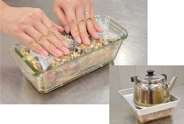 ラップで上部をカバーし、重しをのせ冷蔵庫で4〜5時間置く。