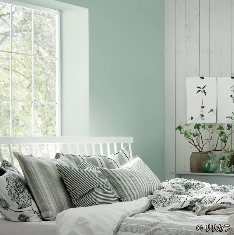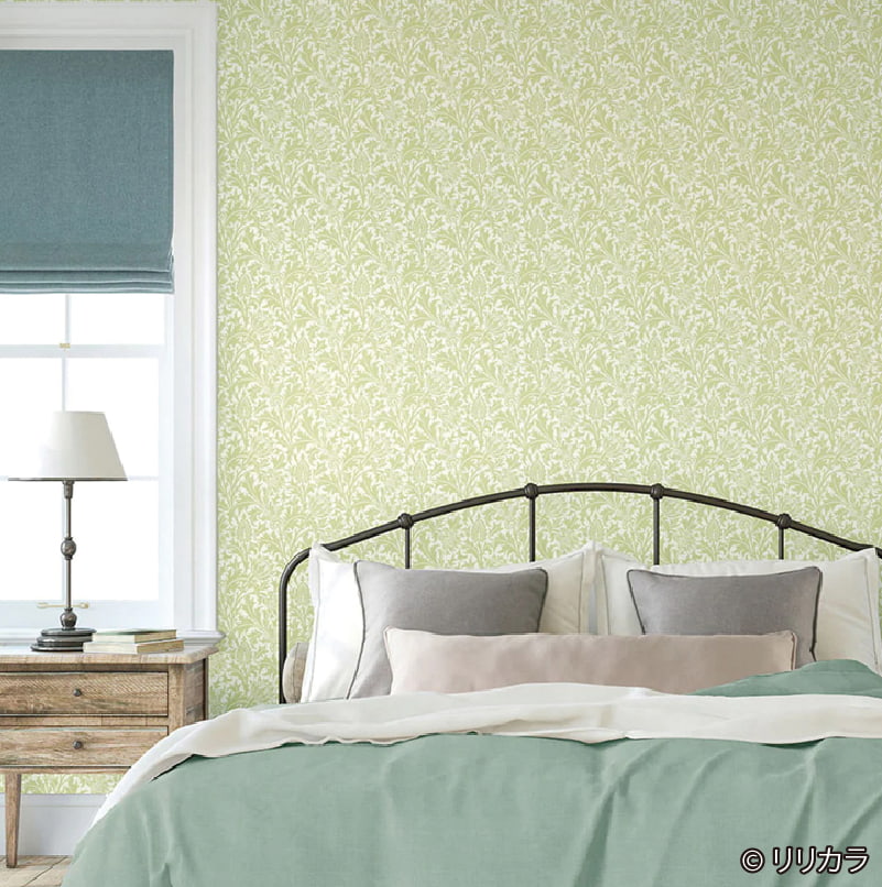 イギリスの調査によると、長く眠れた部屋の色は上から順に青、クリームイエロー、緑だったそうです。逆に、睡眠時間が短かったのは紫、茶、灰色の部屋でした。グレーの壁紙は最近の流行りですが、寝室には避けたほうがいいようです。リラックス効果もある緑色なら、寝室に最適ですね。