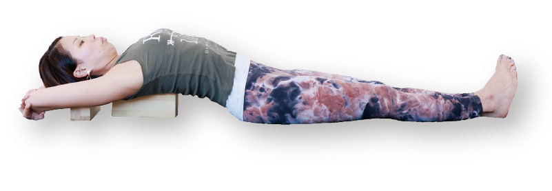 ブロックを2つ用意。 床に両脚を伸ばして座り、背すじを伸ばし坐骨を立てる。 あお向けになったとき、 ブロックの一つが肩甲骨のあいだに縦向きに、 後頭部の下では横向きになるよう、 位置を調整。