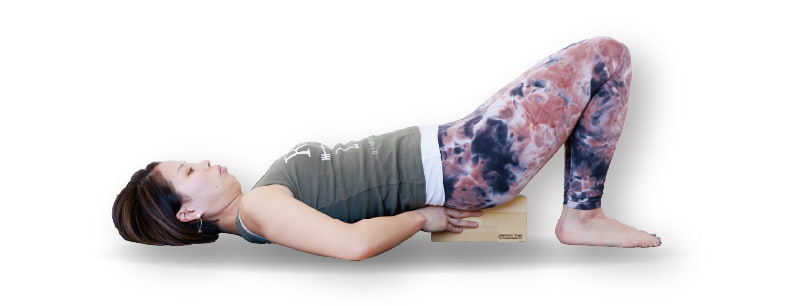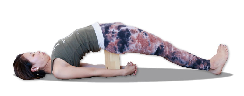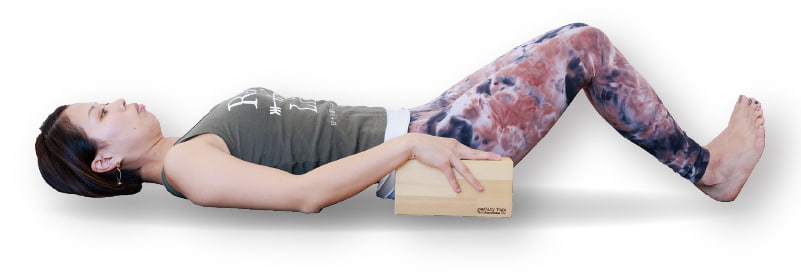 ポーズを終えたら、 ひざを立て腰を浮かせてからブロックをはずし、 ゆっくり腰を床に下ろす。